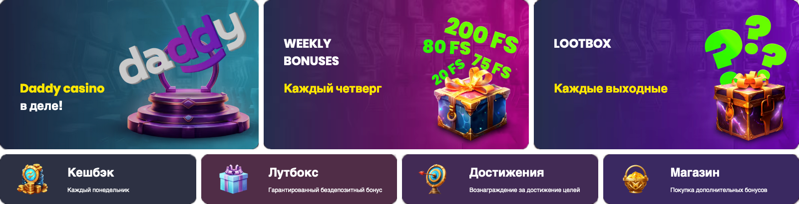 Daddy казино представляет собой современный и комфортный портал для игры. Здесь доступны все виды азартных услуг, бонусы, индивидуальные подарки и привилегии программы лояльности. Клиентам гарантируются безопасность игры и транзакций, сохранность и конфиденциальность персональных данных. Поддержка Дэдди постоянно находится на связи и консультирует посетителей по любым тематическим вопросам.